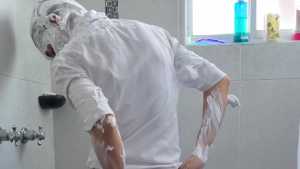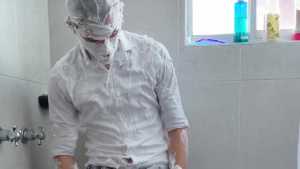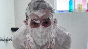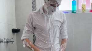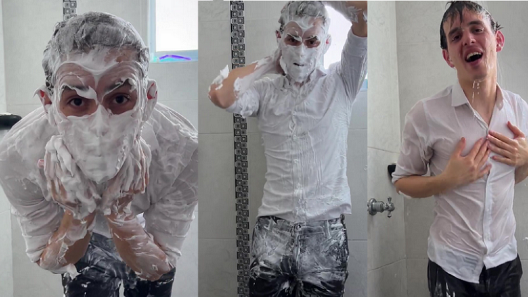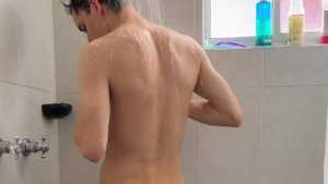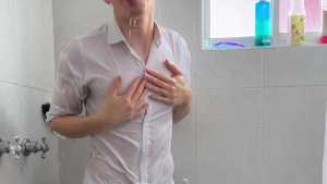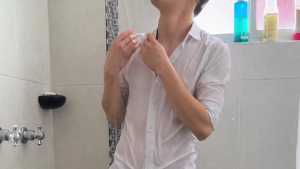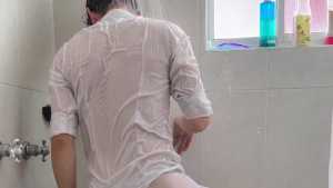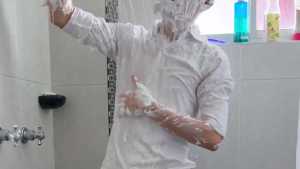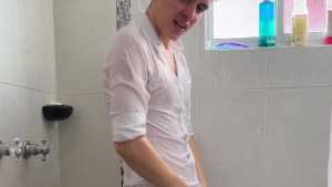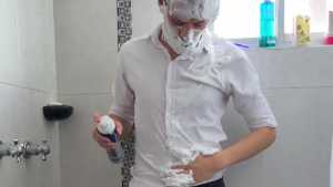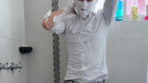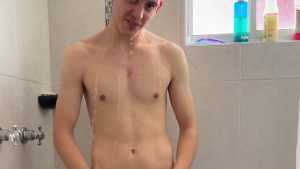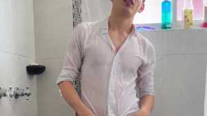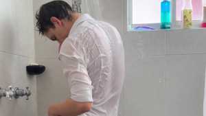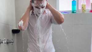 A wonderful scene with Liam B in amazing shape. Fun and sexy, he plays with shaving cream, getting messy. His face and hair are covered in it, and soon his shirt and pants are also dirty. He enjoys it and then turns on the shower to clean himself off. His white shirt becomes see-through due to the wet look, and his striptease is super sexy!
